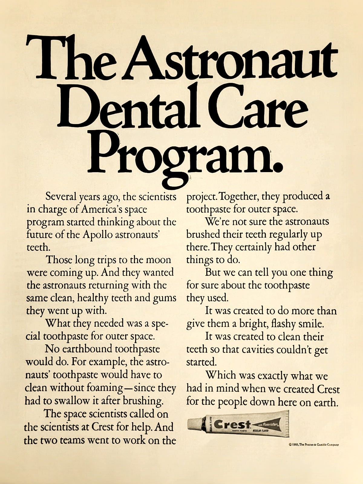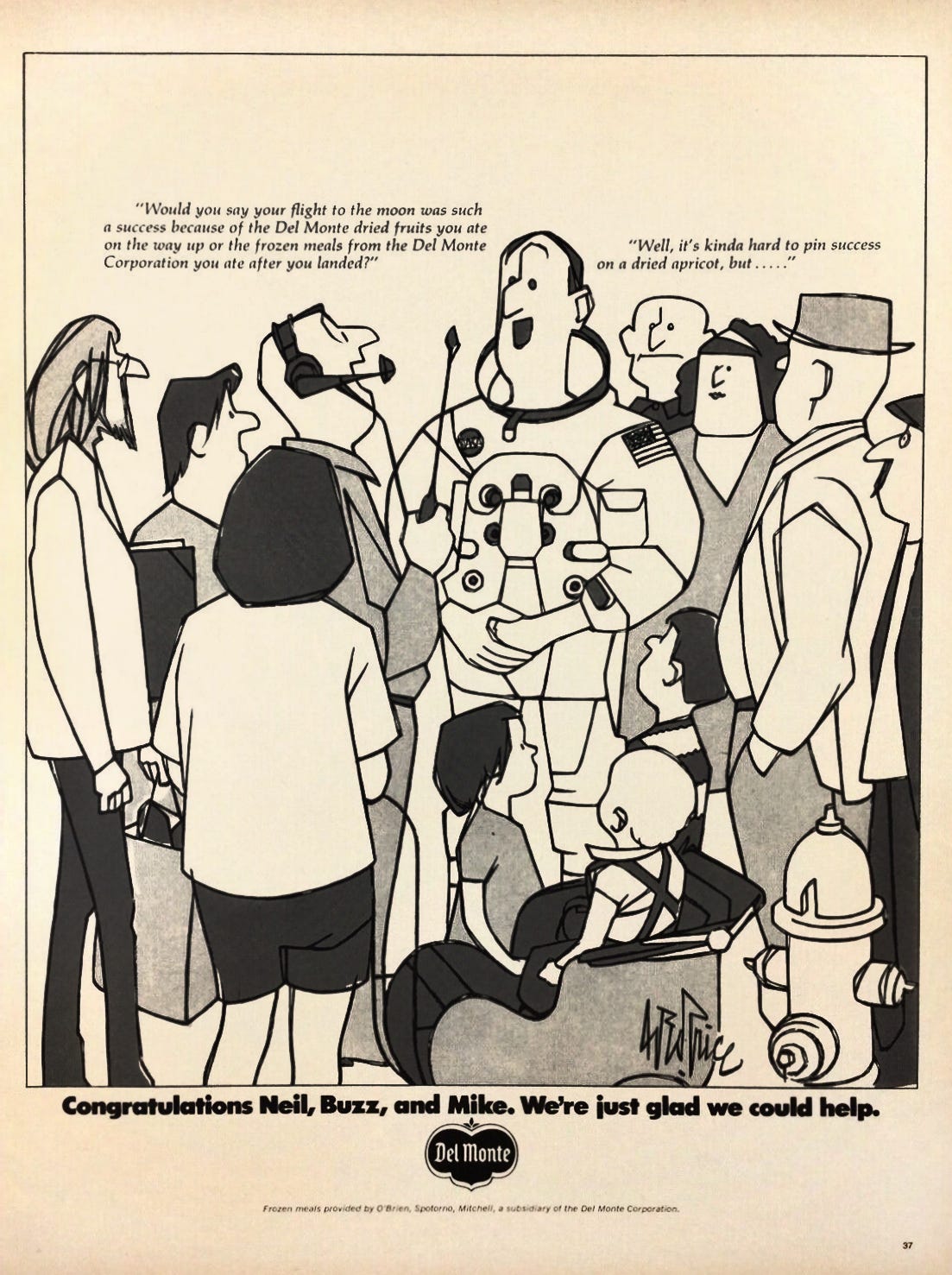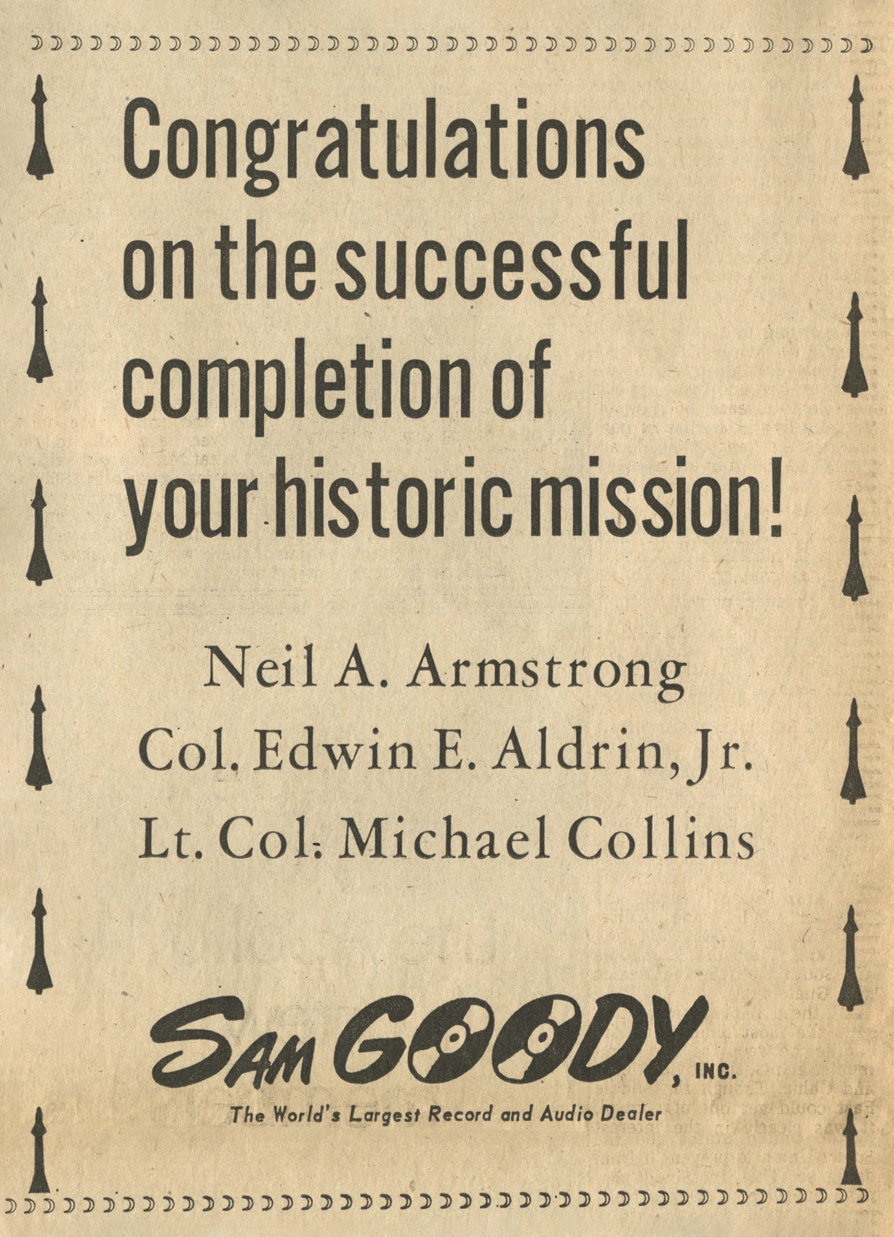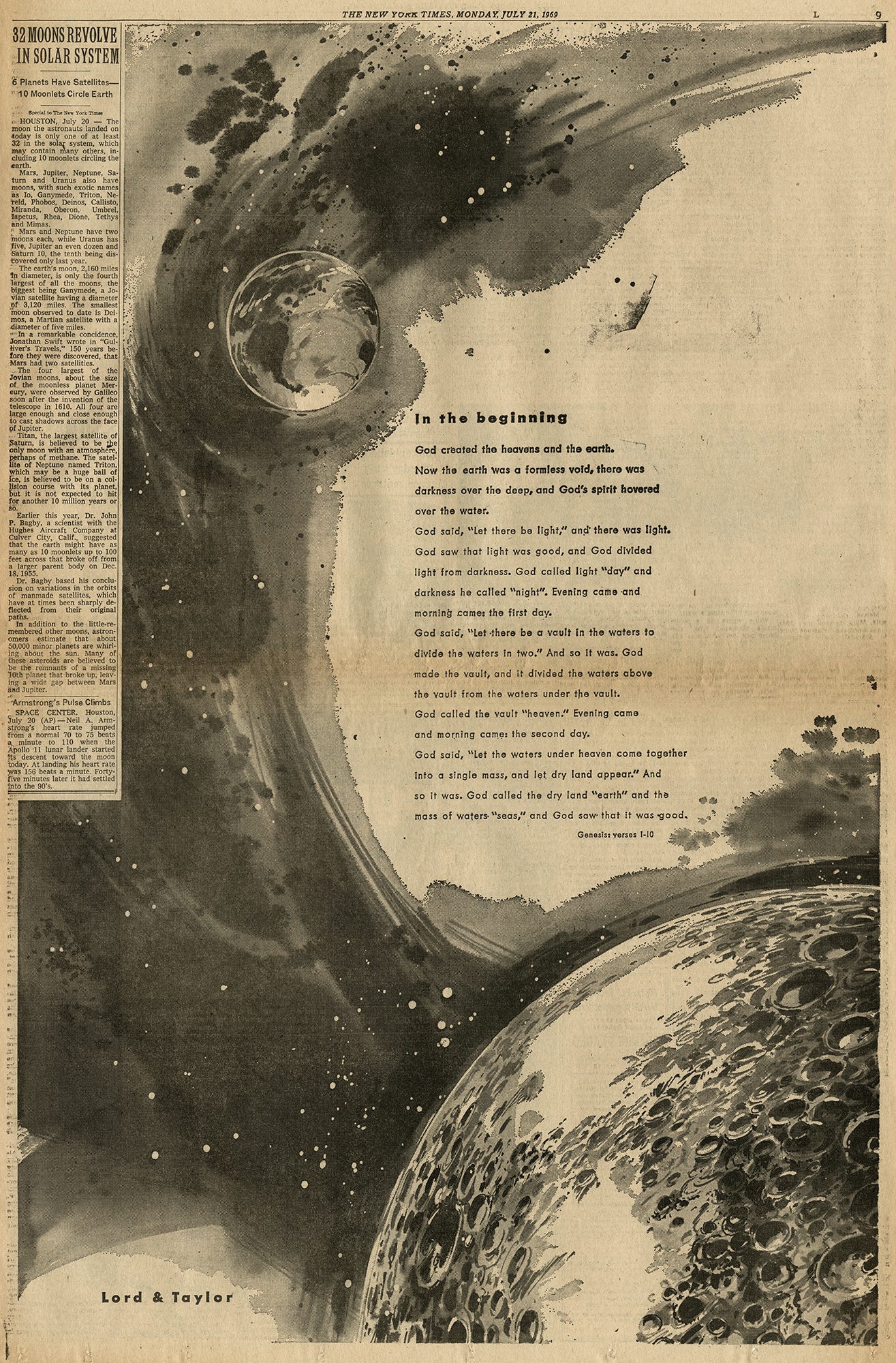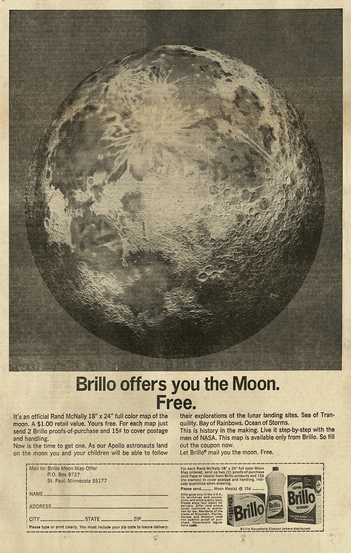 What I was most surprised to see were these ads. In honor of the landing, department stores like Lord & Taylor and Gimbels published illustrated poems about Genesis and stargazing, Brillo offered a free poster of the moon with purchase, and brands like Sam Goody and Hunting World wrote congratulatory letters. Of course, this was not limited to the July 21, 1969 issue of the NYT. This moon-vertising appeared for months before and after the landing; it was an event so widely understood that nearly any company could plug into it. Some advertisers had a legitimate connection to the mission—Omega supplied space-friendly watches and IBM provided research muscle—but most relied on far more tenuous associations. See: astronaut toothpaste, fruit, or tampons. All together, I read these as a case-study in virality, decades before social media existed. Far out.