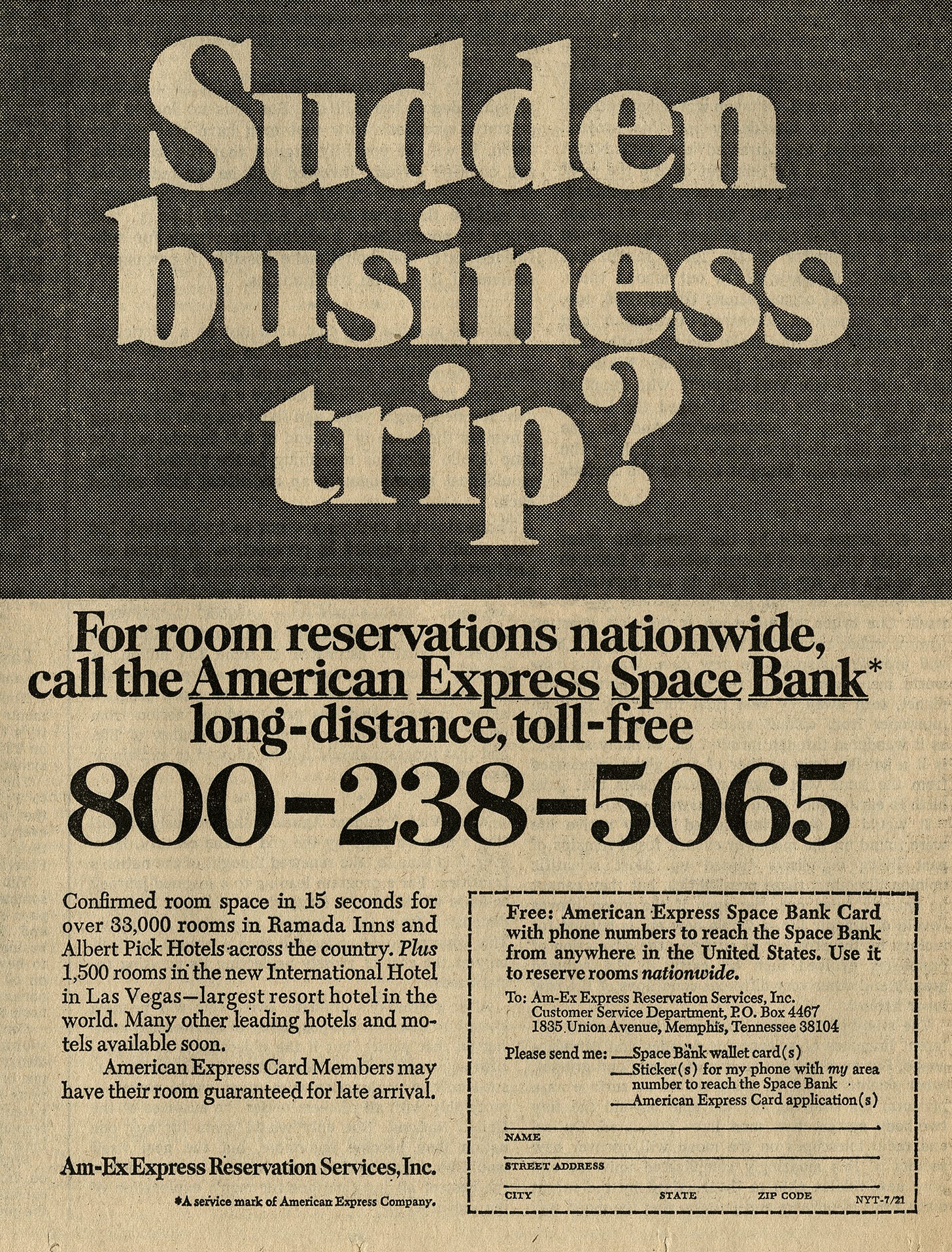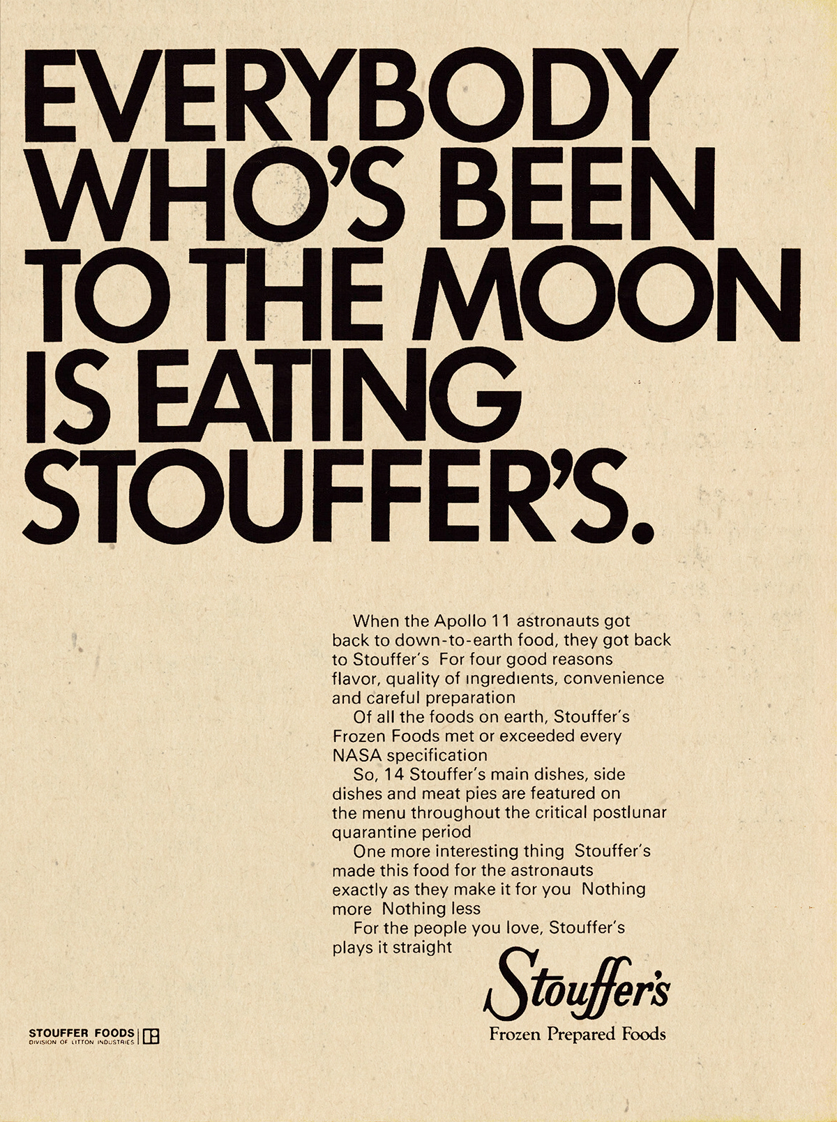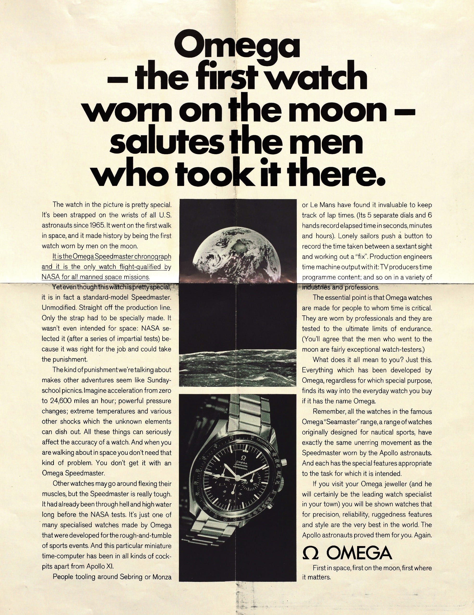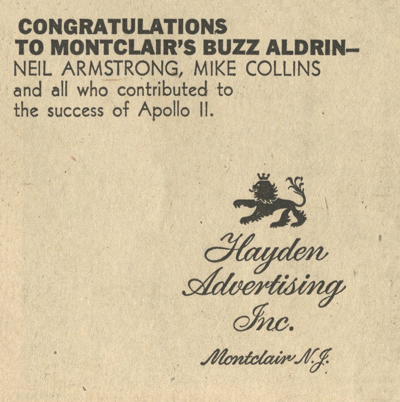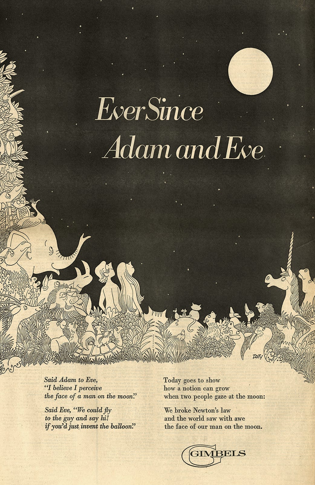 What I was most surprised to see were these ads. In honor of the landing, department stores like Lord & Taylor and Gimbels published illustrated poems about Genesis and stargazing, Brillo offered a free poster of the moon with purchase, and brands like Sam Goody and Hunting World wrote congratulatory letters. Of course, this was not limited to the July 21, 1969 issue of the NYT. This moon-vertising appeared for months before and after the landing; it was an event so widely understood that nearly any company could plug into it. Some advertisers had a legitimate connection to the mission—Omega supplied space-friendly watches and IBM provided research muscle—but most relied on far more tenuous associations. See: astronaut toothpaste, fruit, or tampons. All together, I read these as a case-study in virality, decades before social media existed. Far out.