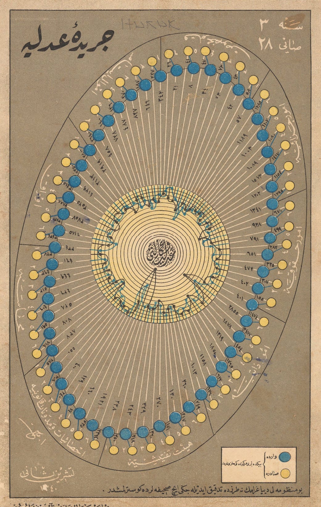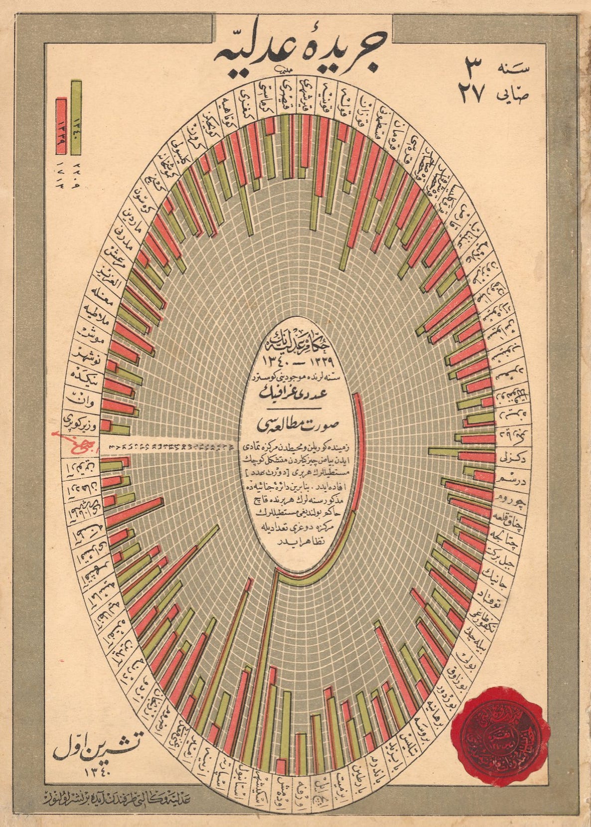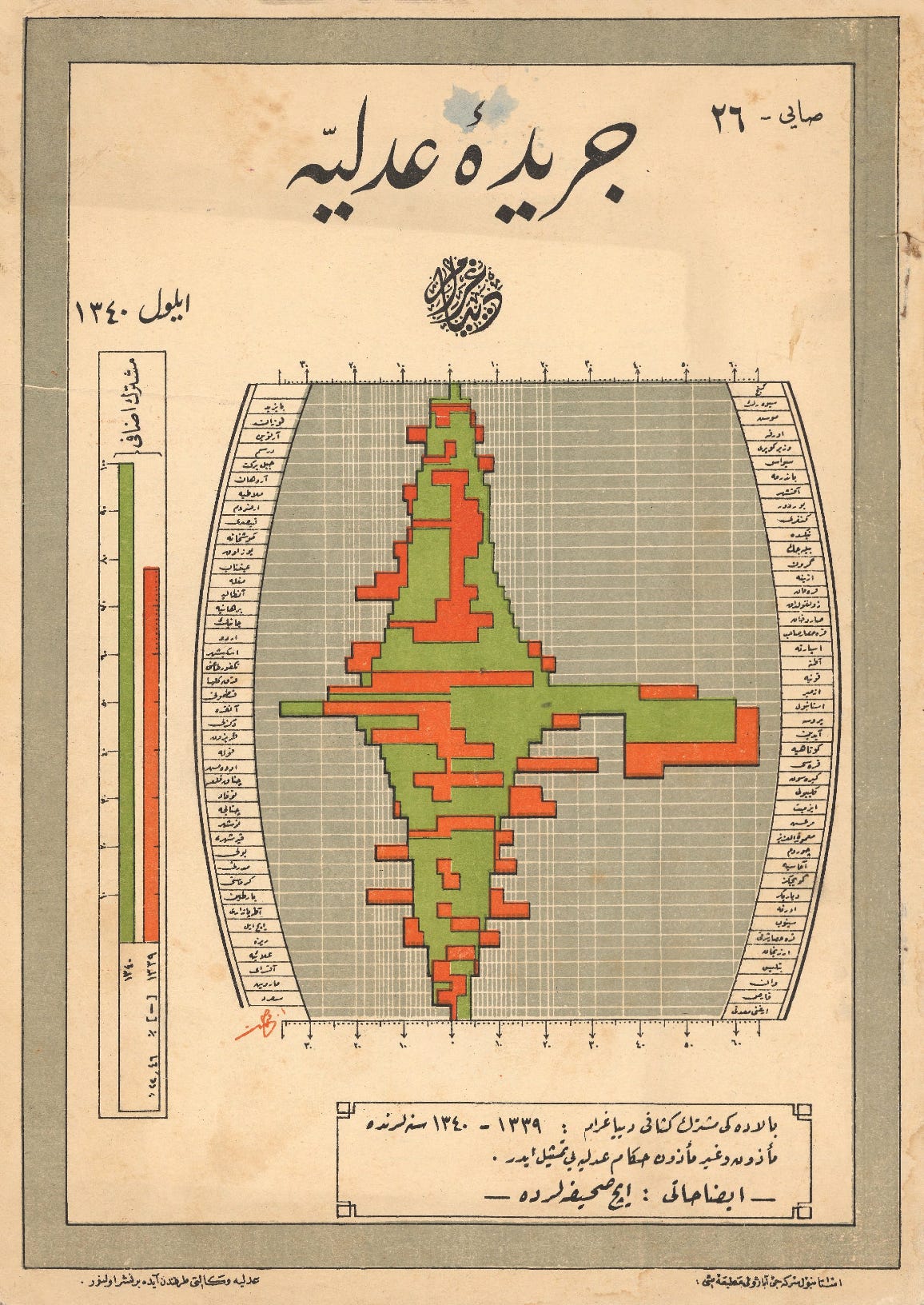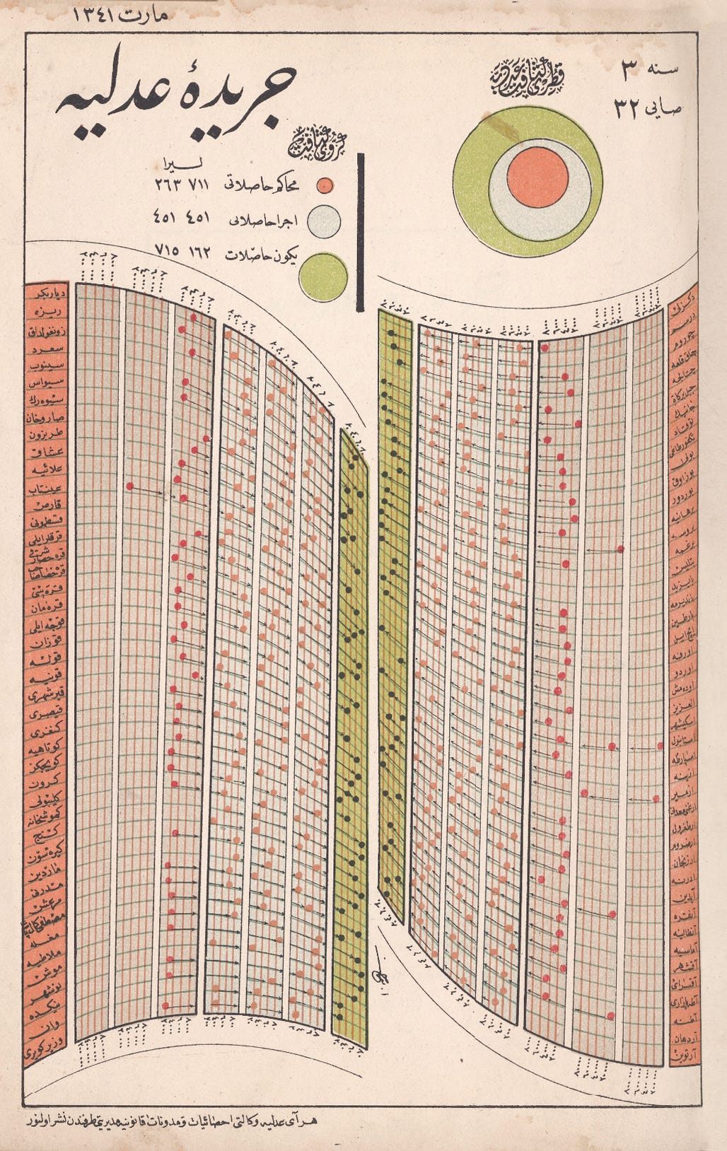 Today’s collection is a set of Ottoman-era data visualizations from Cerîde-i Adliyye, “The Justice Gazette,” a Ministry of Justice publication printed in Türkiye in the mid-1920s (thanks to chart-maker and -enthusiast Juweek Adolphe of Gourmet Data, who shared them in a design-y Slack group I’m in.)